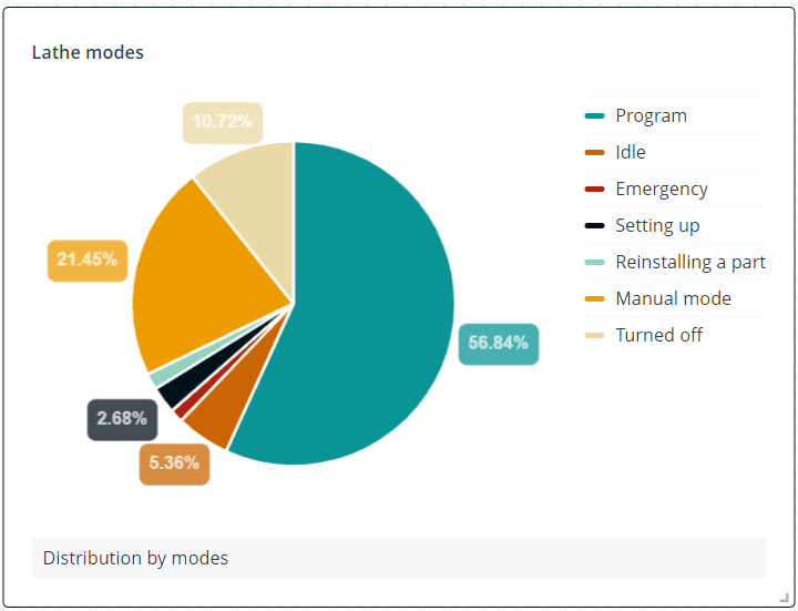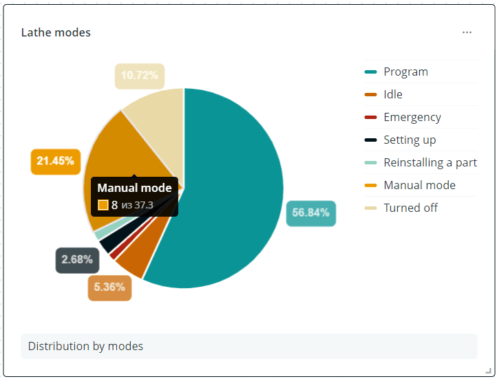 - Круговая диаграмма - круг, разделенный на сектора, где каждый сектор отражает долю (процент) значения одного аргумента относительно суммы значений всех аргументов, выбранных в качестве источника данных. Такой виджет позволяет быстро сравнить небольшой набор величин и оценить долю каждого значения по сравнению с другими секторами и со всей круговой диаграммой. Например, его можно использовать для отображения длительности работы оборудования в разных режимах, причин инцидентов по категориям;