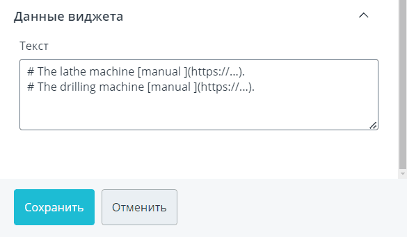 Данный виджет - единственный, в котором не нужно выбирать ни объект, ни аргумент. Просто напишите свой текст в обычном формате или используйте разметку Markdown.
