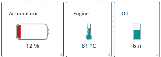- Батарея, Колба, Термометр - схематичные изображения батареи, колбы и термометра соответственно, где цветом выделяется процентная доля заполнения для аргумента, выбранного в качестве источника данных;