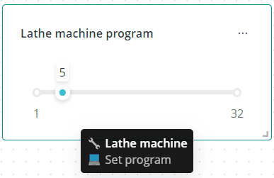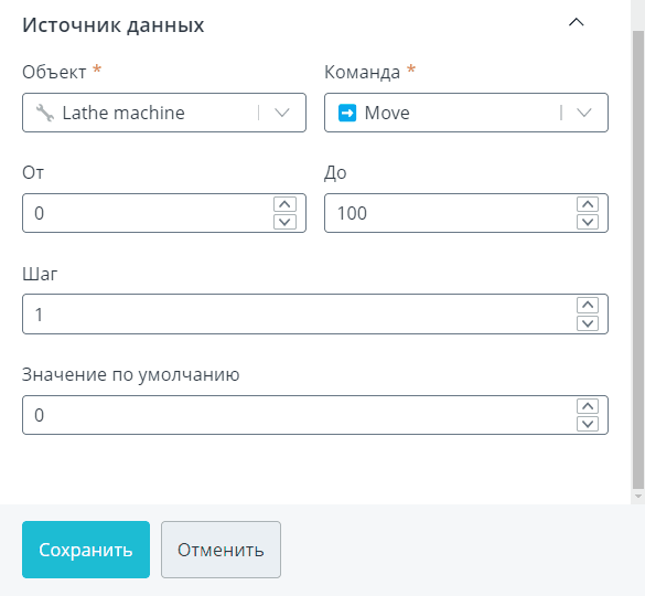 Выберите один интересующий вас объект. Из списка команд этого объекта определите команду, в данных которой будет отправляться числовое значение, заданное положением ползунка. Задайте начальную и конечную границу ползунка, а также значение по умолчанию. Также вы можете установить шаг, с которым будет перемещаться ползунок.