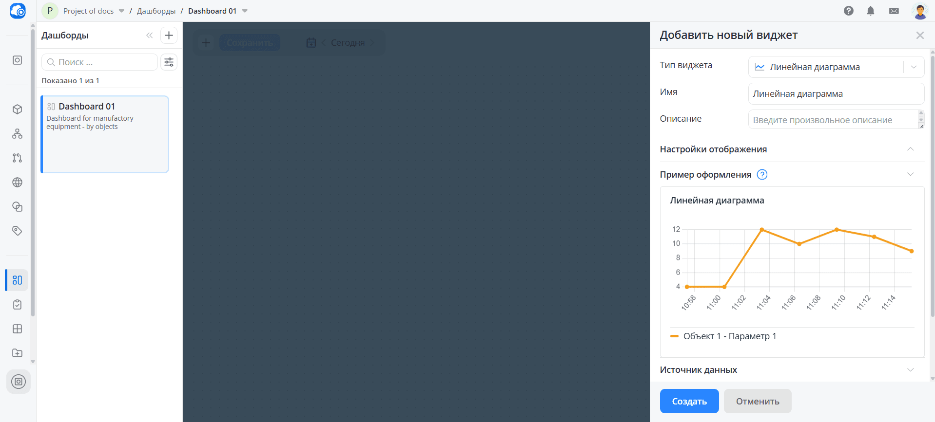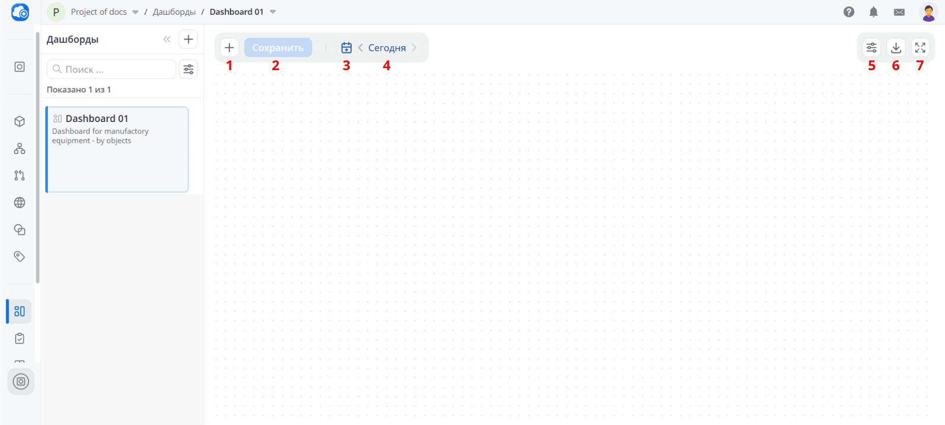 При создании нового дашборда выберите тип По объектам и нажмите кнопку Создать. Перед вами откроется пустая рабочая область, на которой вы расположите виджеты - главные элементы дашборда.