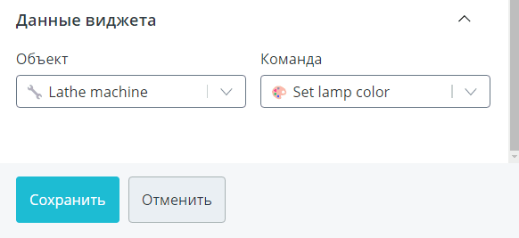 В списке возможных для выбора команд присутствуют только те, у которых в модели задан строго один параметр, значение которого можно указать непосредственно при отправке команды. Такие же команды используются в качестве источников данных для виджетов Ползунок и Цвет.