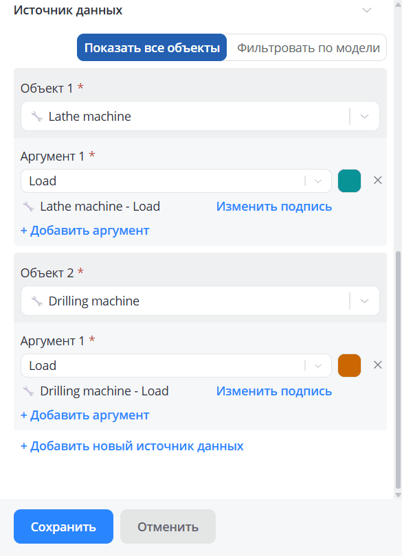 Выберите один или несколько интересующих вас объектов. Для каждого объекта задайте аргументы, значения которых будут использоваться в качестве источников данных. В списке возможных для выбора параметров доступны только те, у которых в модели указан тип данных Число. Суммарно по всем объектам можно добавить до 20 аргументов. Также вы можете переименовать название источника данных и задать свой цвет для каждого аргумента.