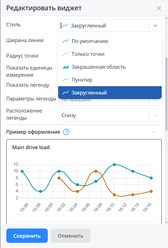 | Стиль | Линейная диаграмма | Выбрать стиль отображения данных виджета на графике: По умолчанию, Только точки, Закрашенная область, Пунктир, Закругленный |