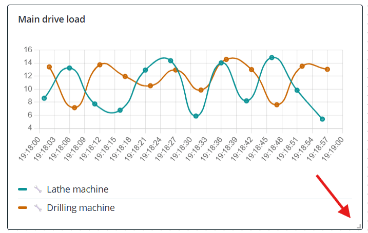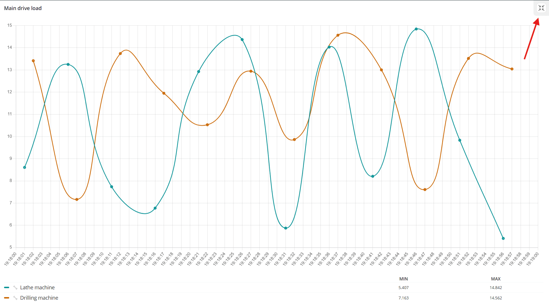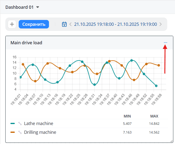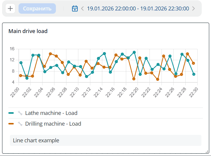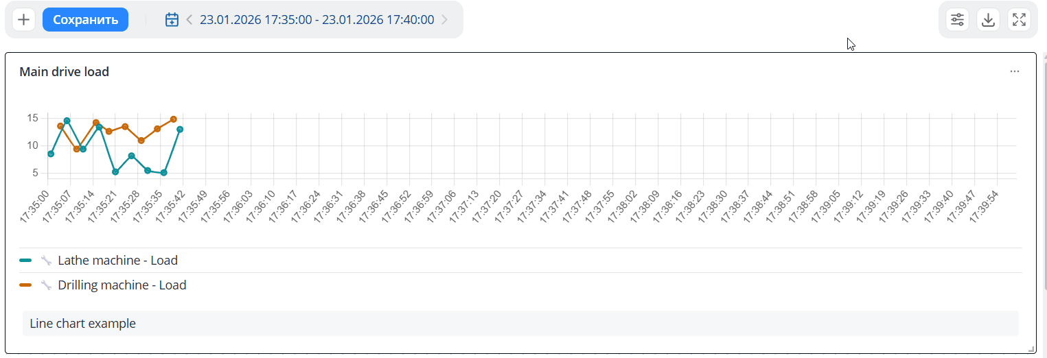 При просмотре данных на линейной диаграмме можно выбрать временной интервал непосредственно на виджете, чтобы крупно рассмотреть нужный участок графика. Для этого зажмите левую клавишу мышки и выделите участок, который необходимо увеличить. В этом случае основной интервал просмотра данных на дашборде также изменяется и соответствует выбранному на диаграмме.