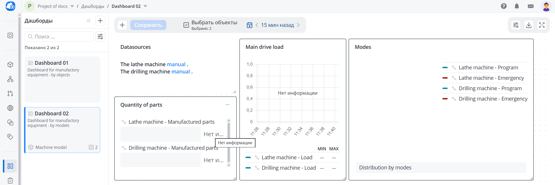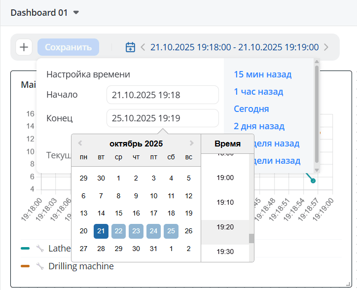 После того как дашборд примет вид, удобный для просмотра данных, приступайте к выбору временного интервала. Данная настройка позволяет выбрать период времени, за который необходимо отобразить данные на дашборде. Есть ряд пресетов, которые можно использовать сразу (15 минут назад, 1 час назад, Сегодня и т.д.), либо выберите конкретную дату и время из календаря. Обратите внимание, что между началом и концом периода может быть интервал не более одного месяца. При переключении между дашбордами выбранный период сохраняется. В случае обновления страницы интервал-пресет также сохранится, а интервал, заданный через календарь, сменится на дефолтный пресет Сегодня.