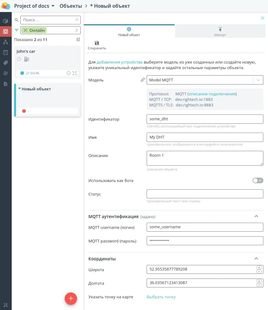 Для того чтобы ввести дополнительную защиту созданного объекта от несанкционированного доступа и подключения к нему на платформе, укажите логин и пароль. В этом случае злоумышленник, зная только идентификатор вашего устройства, не сможет подключиться к объекту. Если потом потребуется снять защиту, сотрите логин и пароль и сохраните.