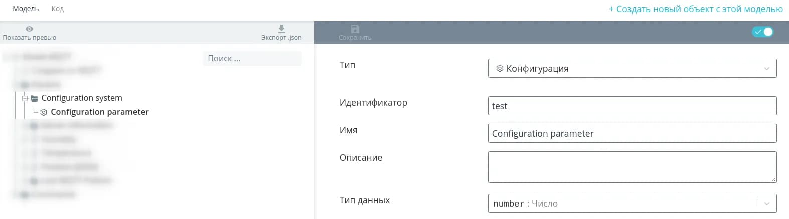 Если в модели присутствуют узлы с типом Конфигурация, то в дополнительных разделах также будут подсистемы со всеми конфигурационными параметрами для заполнения.