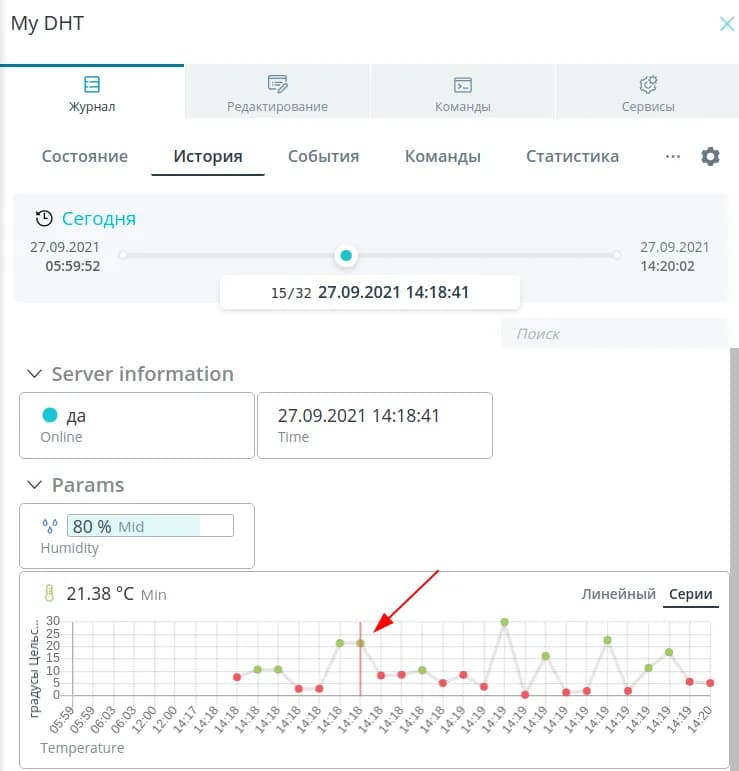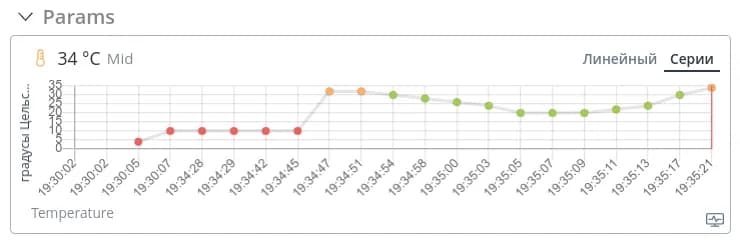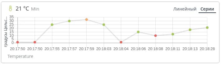 В режиме Серии сетка времени масштабируется таким образом, чтобы показания отображались равномерно независимо от того, какая задержка по времени между ними. Этот режим удобен, когда устройство долго не отправляло данные, либо наоборот - шлет данные очень часто.