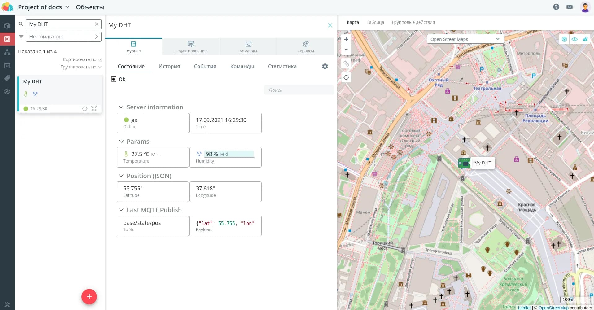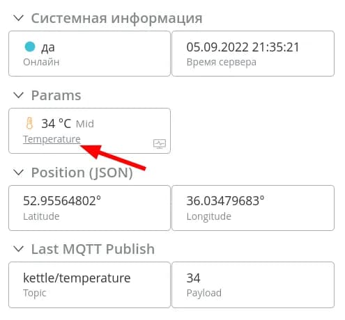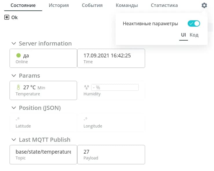 После успешной авторизации у объекта сразу сменится статус Online и появится время получения пакета. При поступлении данных они отобразятся в интерфейсе в соответствии с моделью. Параметры, которые присылает устройство, но не созданные в модели с нужным источником, отображаться не будут.