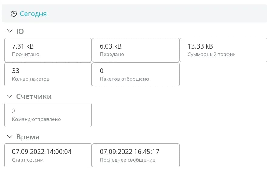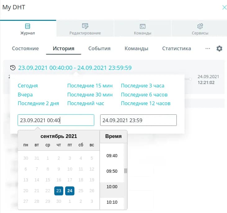 В разделе История вы можете получить историю пакетов данных от устройства за выбранный период. Есть ряд пресетов, которые можно использовать сразу (Сегодня, Последние 2 дня, Последний час и т.д.), либо воспользуйтесь выбором конкретной даты и времени из календаря. Обратите внимание, что для выбора доступны только те даты, в которые устройство присылало данные.