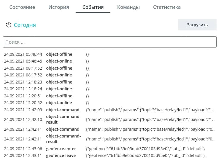 В разделе События вы можете посмотреть историю всех зафиксированных действий, которые происходили с устройством, за выбранный период. Там могут быть как встроенные в систему события, так и дополнительные события, созданные в модели объекта.