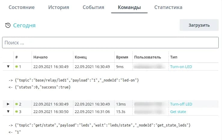 История команд позволяет просматривать все отправленные на устройство команды за выбранный период вместе с их результатом исполнения. Разверните конкретную команду, чтобы увидеть ответ от устройства.