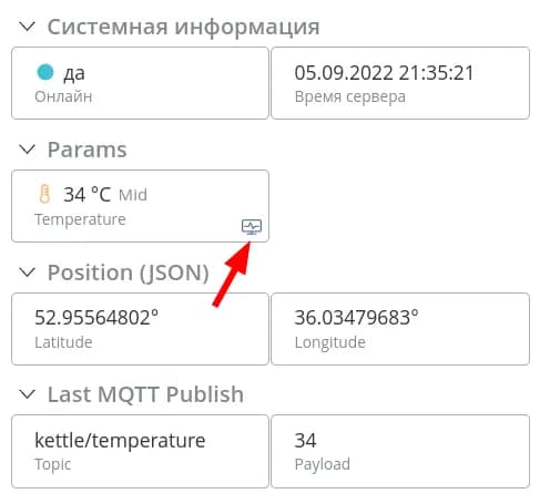 Для просмотра графика по параметру нажмите на иконку в правом нижнем углу его карточки. Она появляется при наведении на параметр и доступна только для числовых и логических типов данных. График формируется за текущие сутки. Для просмотра графика за определенный период перейдите на вкладку История.