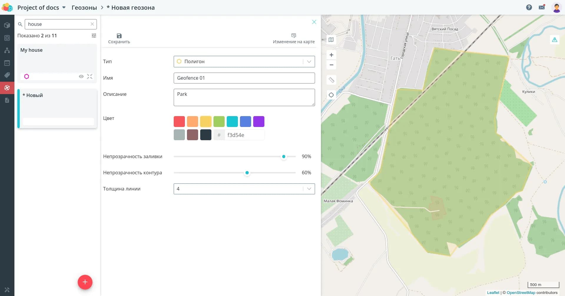 непрозрачность контура — процент, определяющий насколько контур геозоны будет просвечивать слой карты, расположенный ниже;