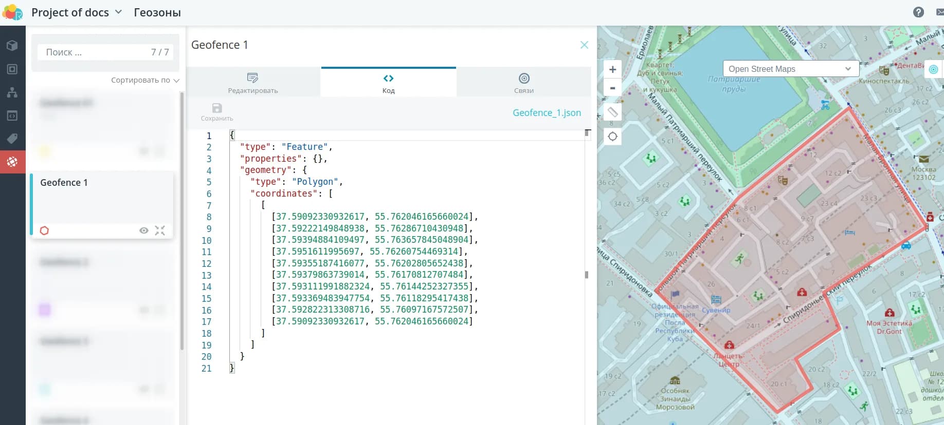 Для экспорта геозоны нажмите на кнопку <имя_геозоны>.json на вкладке Код.