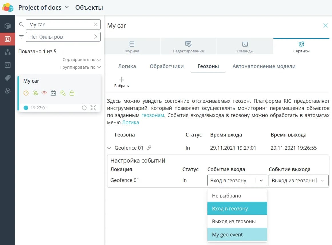 После того как от устройства придет пакет с координатами, назначенная геозона отобразится в интерфейсе объекта с актуальным статусом In/Out.