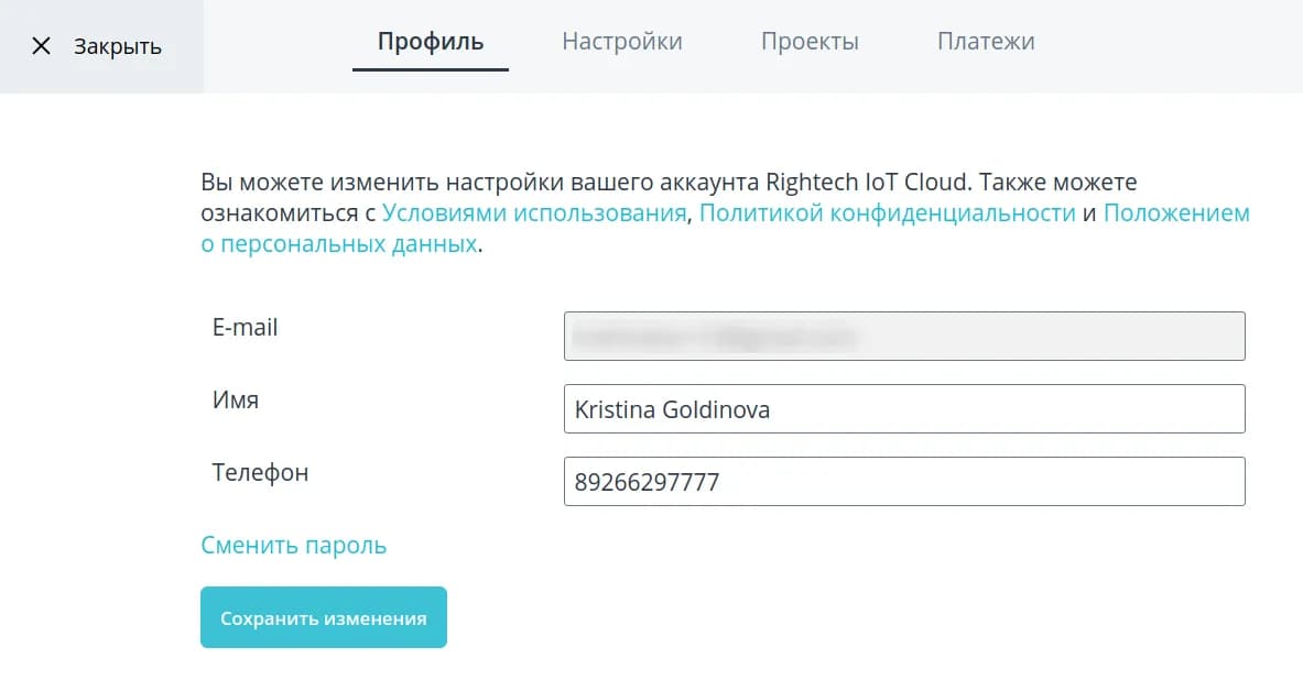 Профиль В разделе Профиль вы можете изменить имя, телефон и сменить пароль от вашей учетной записи. После внесения изменений нажмите Сохранить изменения.