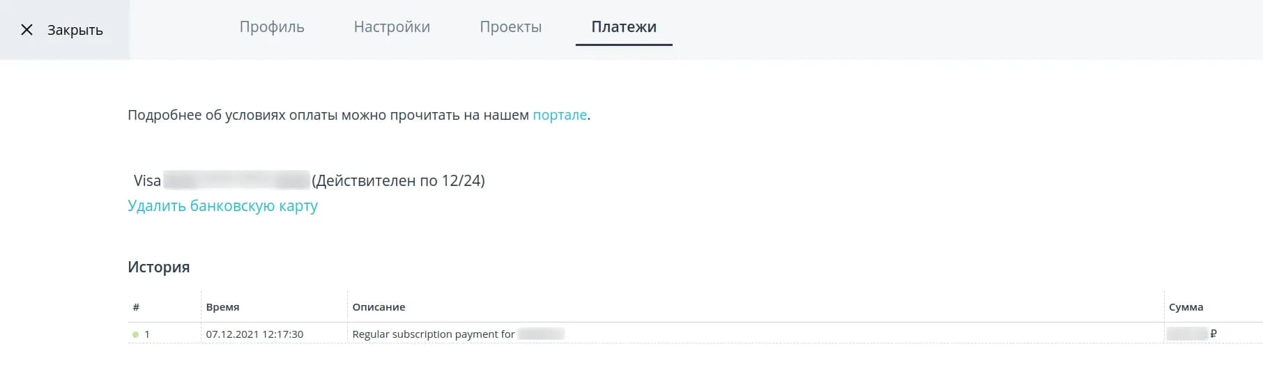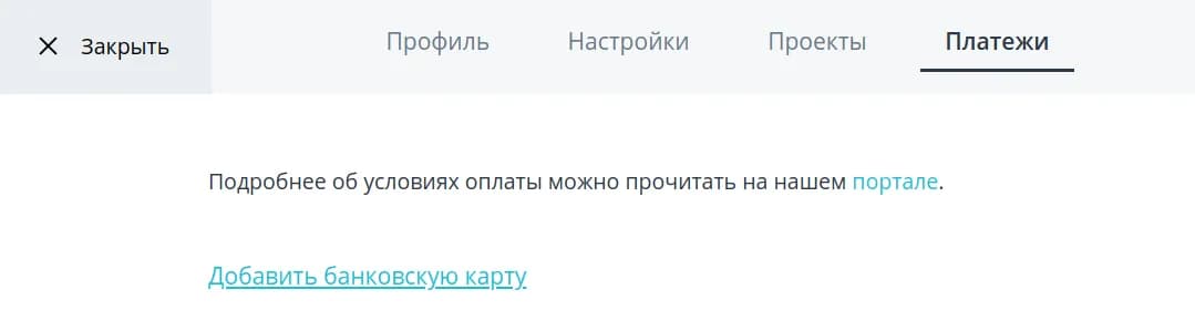 В раздел Платежи вы можете добавить банковскую карту для оплаты лицензий по вашим проектам. Нажмите на кнопку Добавить банковскую карту.