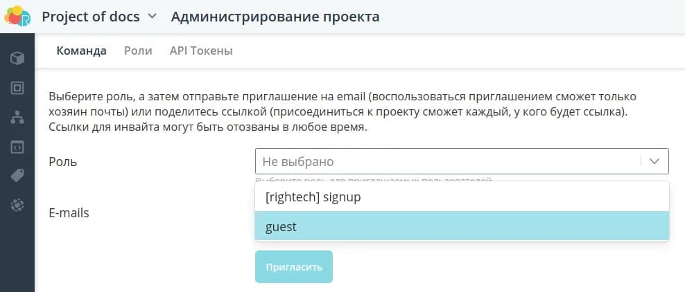 Для того чтобы приглашать пользователей, необходимо выбрать роль, с которой они присоединятся к проекту. По умолчанию доступна роль [rightech] signup с максимальными правами на управление сущностями, но можно создать другие роли с любым набором доступных методов.
