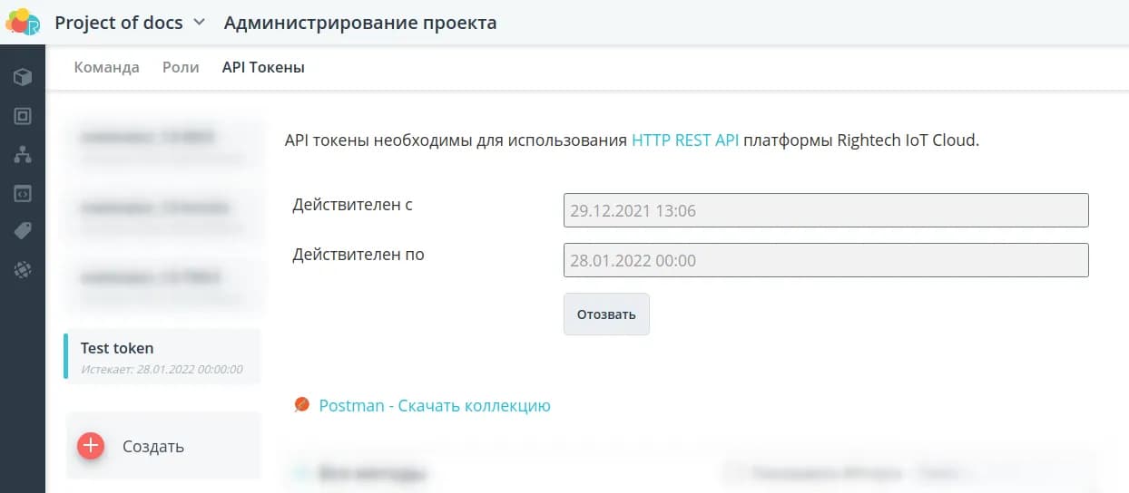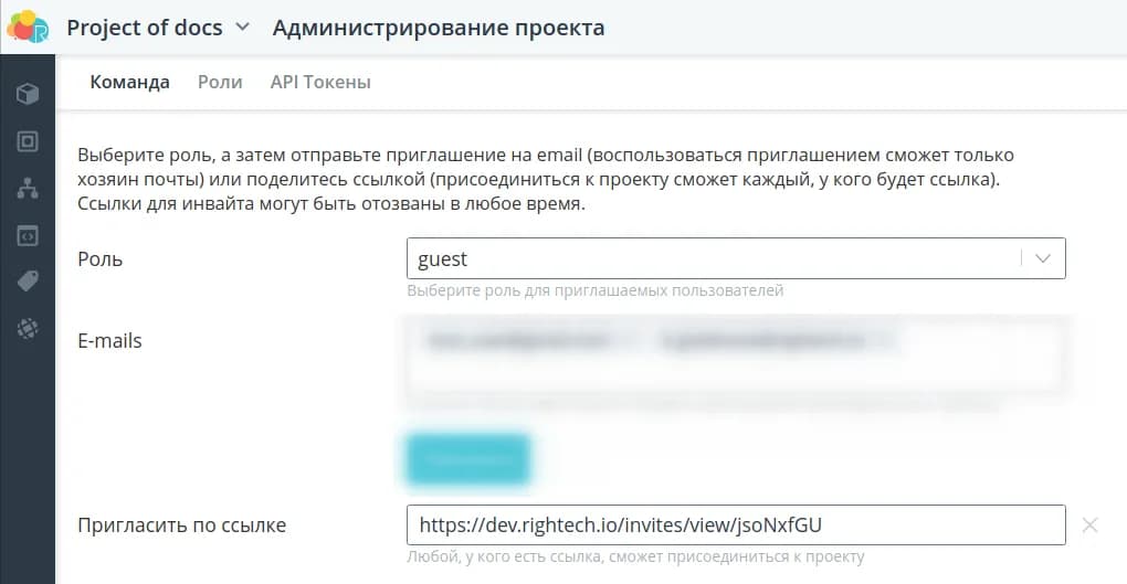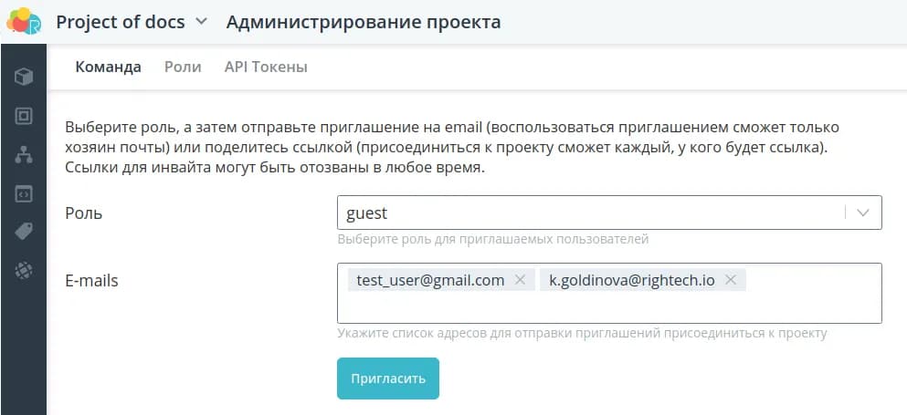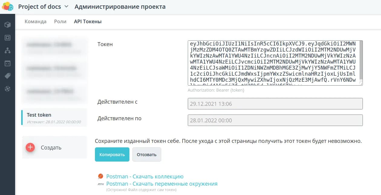 Перейдите на вкладку Администрирование проекта, чтобы управлять командой проекта, ролями и издавать API токены.