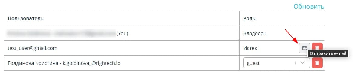 В таблице располагается список пользователей проекта, их роли и статус отправленных приглашений. Владелец проекта может исключать пользователей из проекта и изменять им роль.