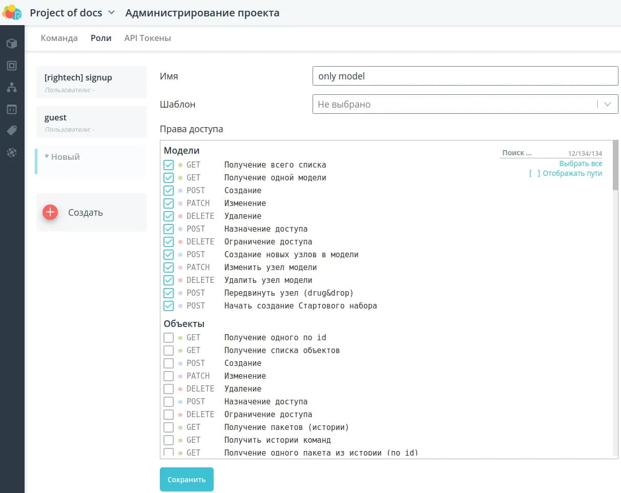 Перейдите в раздел Роли. Для создания новой роли нажмите кнопку Создать. Заполните имя и при необходимости выберите шаблон с готовым набором прав доступа. Затем выберите методы, доступные для новой роли.