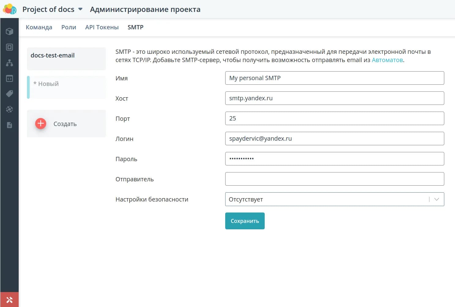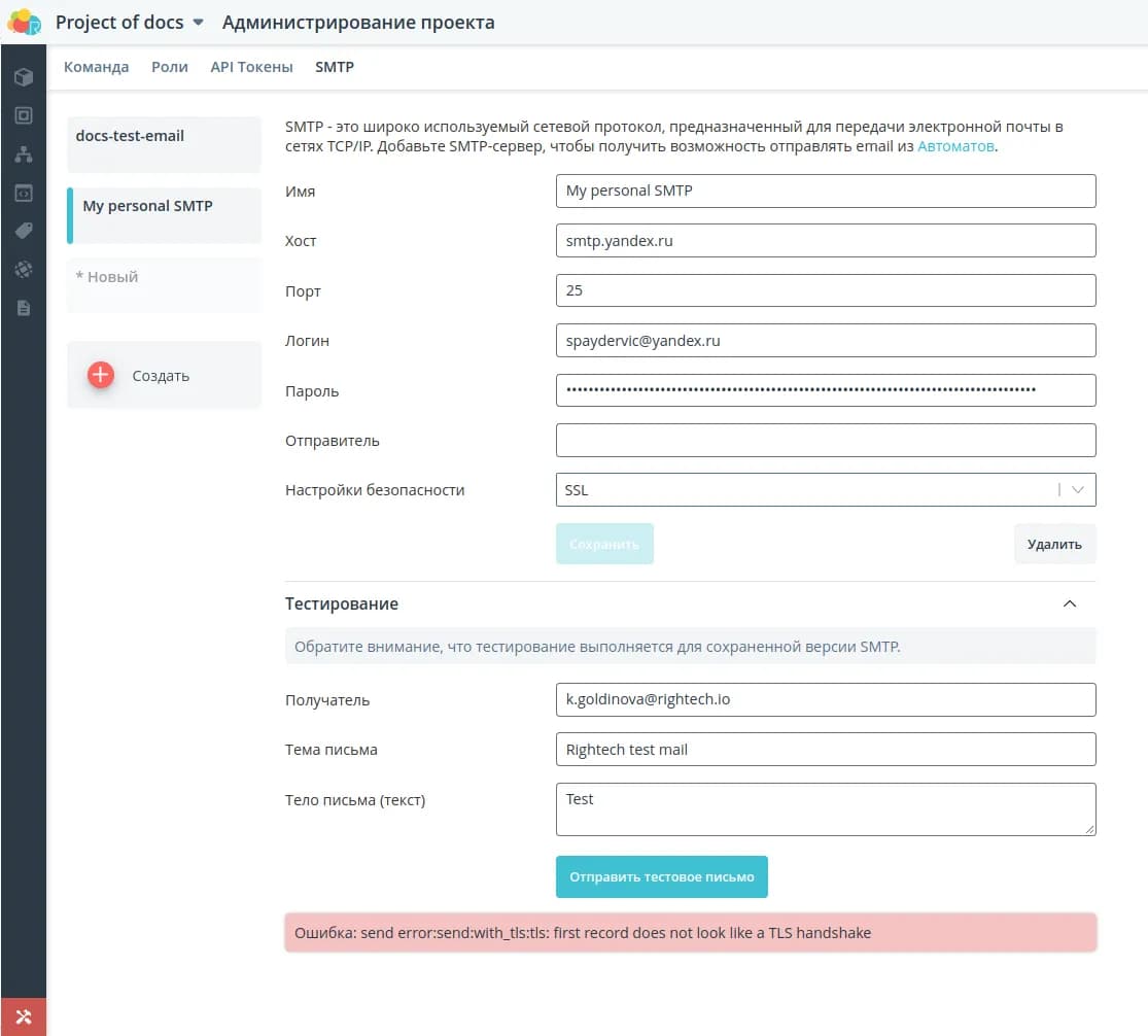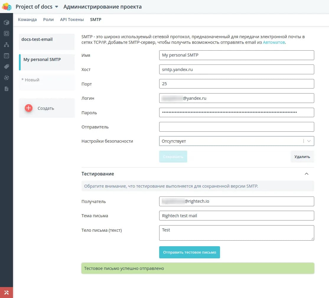 В разделе SMTP вы можете создать SMTP-сервер, чтобы использовать его для отправки email из автоматов.