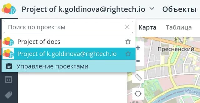 Для создания нового проекта перейдите в меню управления проектами, нажав кнопку Управление проектами в списке проектов.