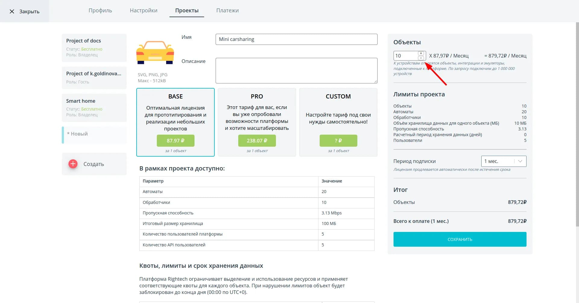 - BASE - платный тариф для небольшого проекта, который появляется, если количество бесплатных проектов исчерпано, настраивается в зависимости от выбранного количества объектов;
